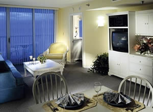 Suites and villas are available with bedding to accommodate four or six guests. One bedroom suites feature a king-size bed and a sofa bed (sleeps 4). Two bedroom suites and vacation villas feature a king-size bed in the master bedroom, two twin beds in the guest bedroom and a sleeper sofa in the living room (sleeps 6).